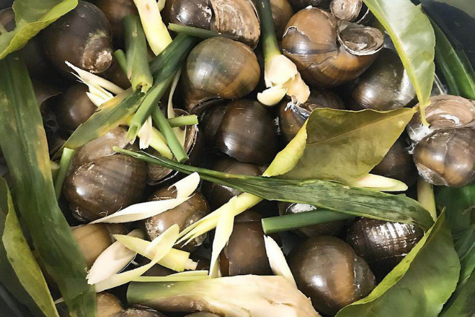- Lemongrass-stuffed snail dish cannot be without lemongrass. Line the bottom of the pot with a layer of crushed lemongrass, then place the briefly boiled snails on top, add a little seasoning (MSG, salt), lemongrass, chili, garlic, and ginger on top. Place on low heat to keep the snails warm.