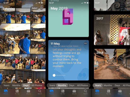 On the main interface of the Photos app, there's an additional Year/Month/Day button for you to explore Memories based on specified timeframes.