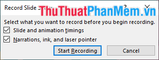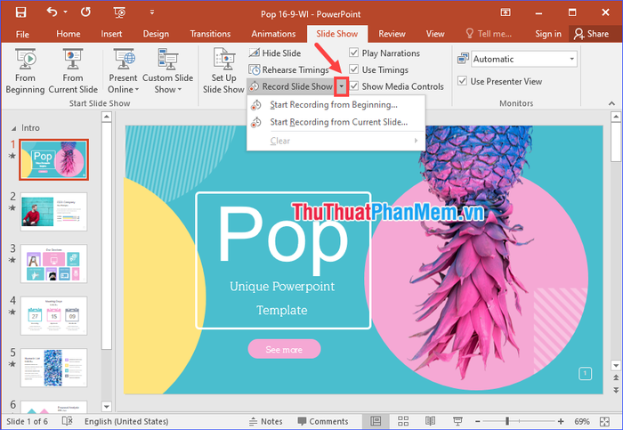 Step 1: Open the Slide Show tab, click the dropdown arrow of Record Slide Show. You have two options: Start Recording from Beginning... or Start Recording from Current Slide.... Choose one according to your preference.