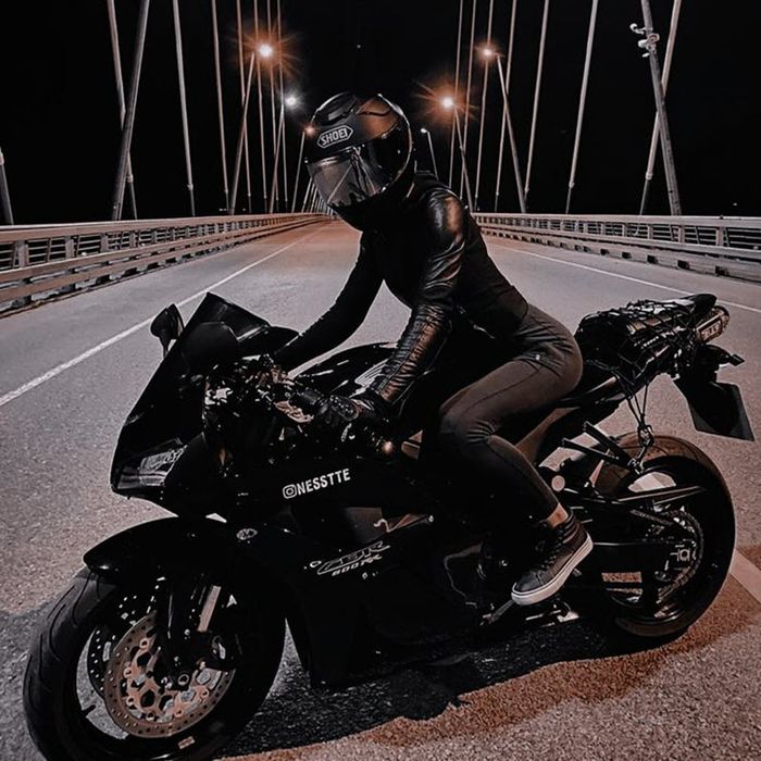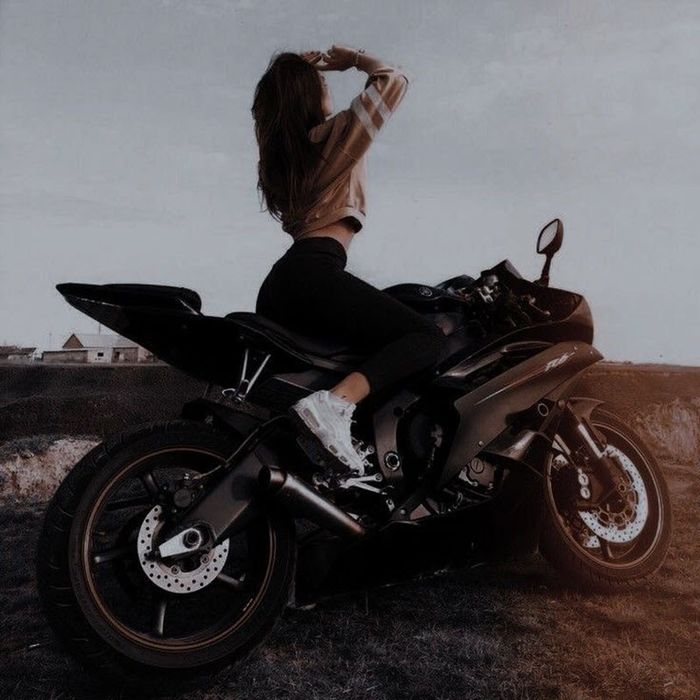 Female avatar with a cool face covering riding a large-displacement motorcycle.
