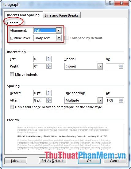+ Outline Level: the level of the paragraph, for example, choose Body Text to define the paragraph as body text, or choose others like headings.