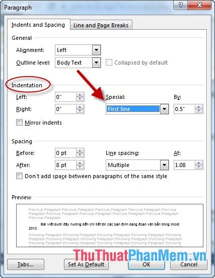+ Special: Determine the type of paragraph indentation, for example, choose First line to indent the first line of the paragraph.