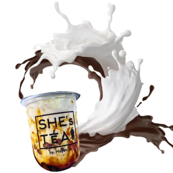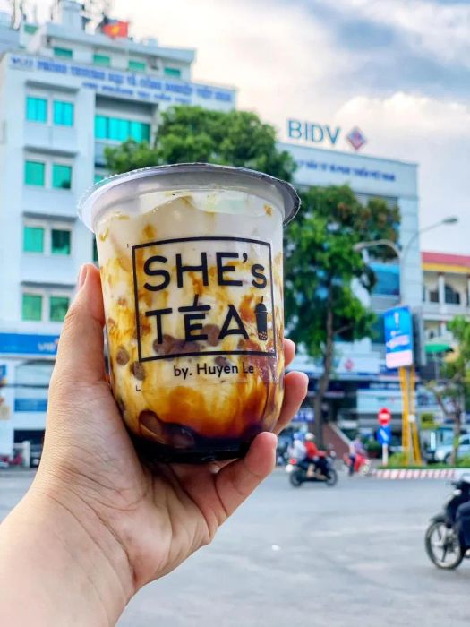 Next up is a well-loved bubble tea spot in Can Tho, especially popular with the local youth in the evenings—She's Tea. This is a completely homemade tea shop offering delicious and affordable bubble tea. You can enjoy your drink on-site or take it to go. The bubble tea at She's Tea is lightly sweet, strong in tea flavor, not too creamy, and comes with generous toppings. The shop is best known for its unique milk tea, but they also offer other drinks like lotus tea, jasmine tea, and fresh milk with brown sugar tapioca.