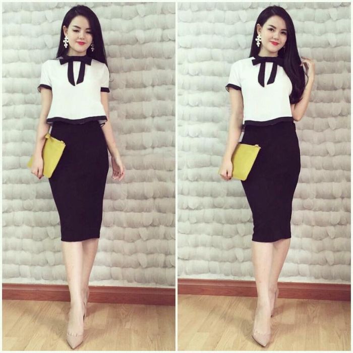 Moreover, the pencil skirt pairs wonderfully with blazers, vests, and cardigans. A simple round-neck shirt with a black pencil skirt has been a staple for office women for years. To stand out, consider choosing a round-neck shirt with pearl details. Tuck it into your skirt for a sleek look and to highlight your waistline. Don't forget to complete the outfit with a pair of heels for a polished look. If you think a peplum top would be hard to match with your pencil skirt, think again! A peplum top paired with a black pencil skirt is a fashionable combo. Since the skirt is already dark, you can opt for a bright-colored peplum to add a youthful, fresh vibe. The peplum top also helps conceal the tummy, making it a go-to for many women. You can even add some subtle details to your skirt, like a ribbed waistband, pleats near the waist, or a small slit at the back, ensuring your pencil skirt never goes out of style.