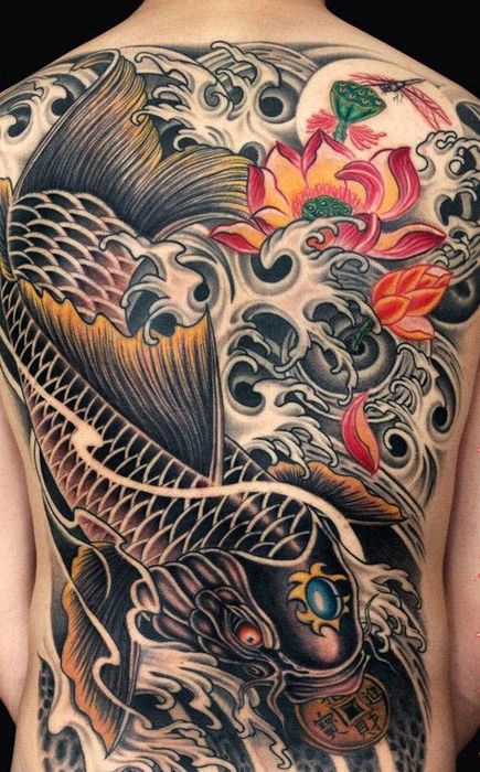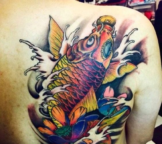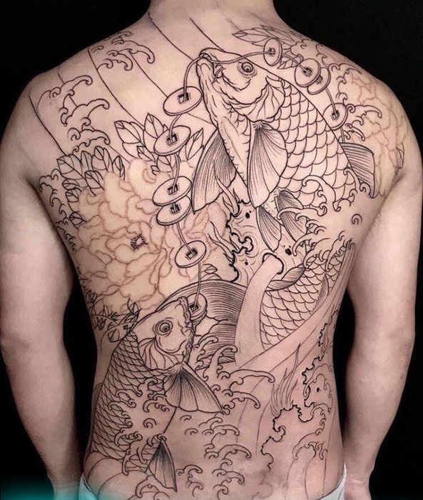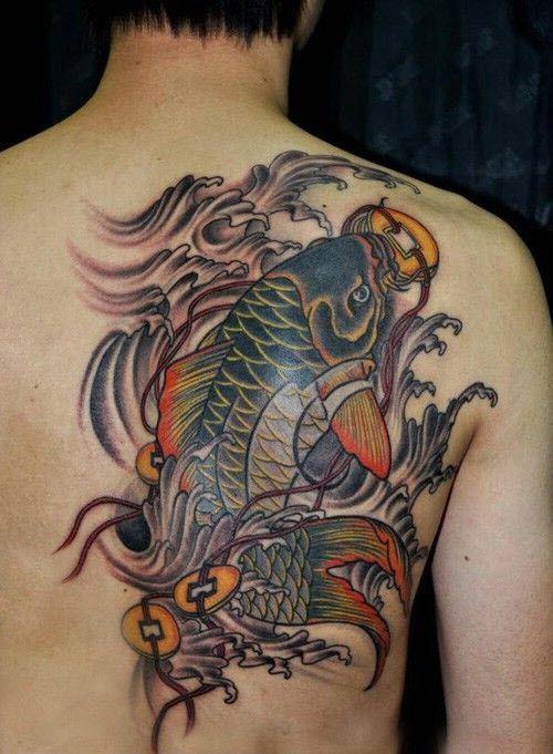 Prosperity-Bringing Koi Fish with Golden Coins Back Tattoo