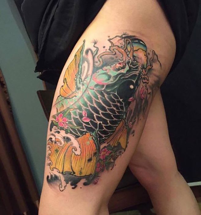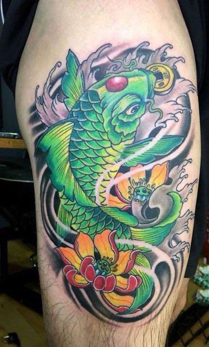 Beautiful Koi Fish Tattoo with Clutched Coins