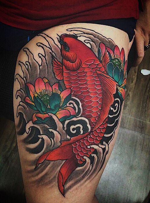 Vibrant Red Koi Fish Tattoo on the Thigh