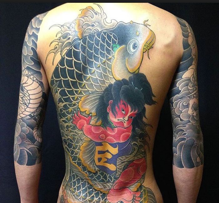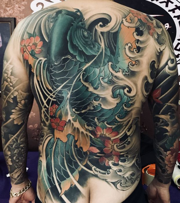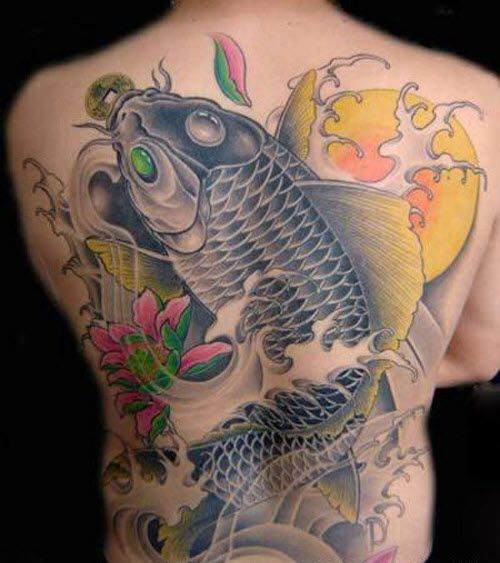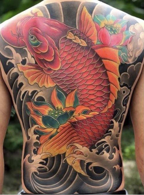 Subtle and Beautiful Koi Fish Full Back Tattoo