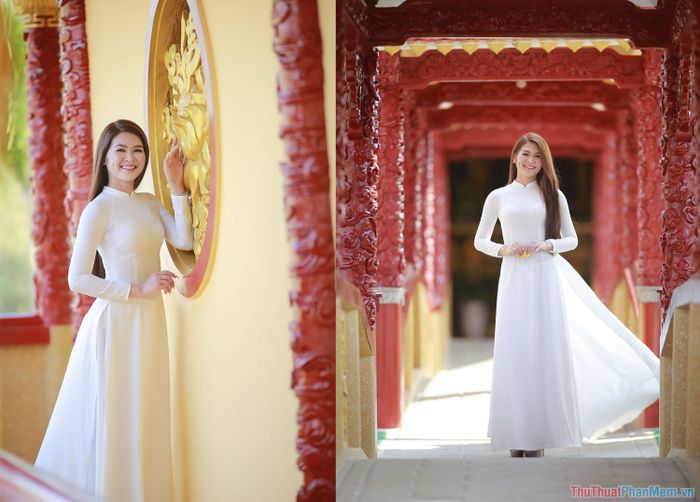 Temples and pagodas, sacred places, inspire many to choose this style for creating the most serene and beautiful photos. In this photography concept, white, red, and yellow ao dai dresses are the top choices. Additionally, the Vietnamese conical hat is an indispensable element enhancing the photo set.