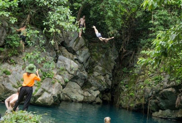 Visiting the Ha Ma Da Valley, travelers can freely enjoy swimming in the lake. For adventure enthusiasts, there's an opportunity to test their skills with the 'cliff jump' game from rock steps ranging from 1.5 to 5.5m high along the mountain cliffs, plunging into the deep waters.