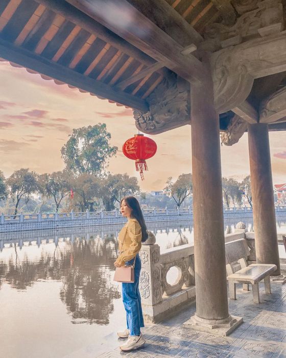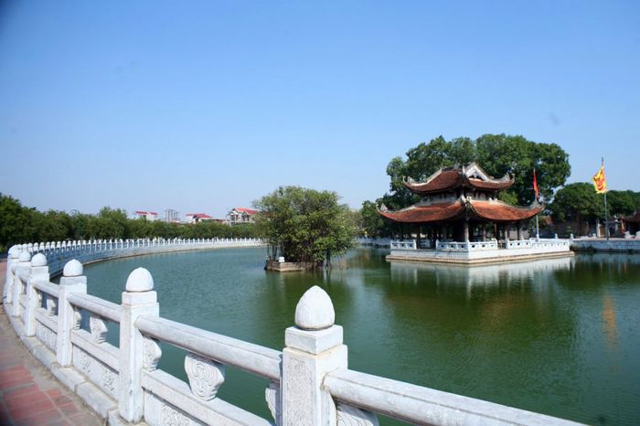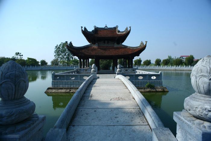 In front of the temple is a water pavilion built on a crescent-shaped lake, spanning 5 bays, where ancient officials used to watch water puppet performances. The ancient water pavilion was chosen by the Indochina Bank to be depicted on the five dong banknote. Since 2003, the state has chosen to depict the water pavilion on the metal coin worth 1000 dong.