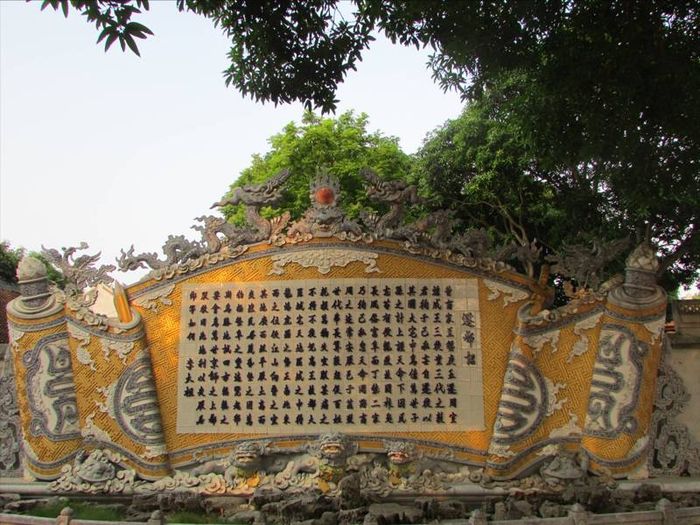 On the eastern side of the temple stands a stele pavilion called the 'Ancient Law Stele Pavilion'. The stone stele is 190 cm tall, 103 cm wide, and 17 cm thick, carved in 1605. It depicts a pair of dragons flanking a crescent moon, surrounded by images of radiance. The stele bears 35 lines of Chinese characters, interspersed with some Nom characters, totaling 1,500 characters.