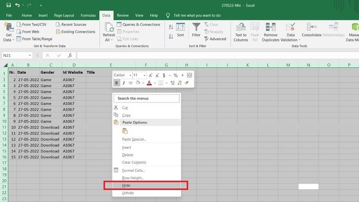 This is the simplest way to hide columns in Excel. Specifically, just select the columns or rows you want to hide > right-click > choose “Hide” to hide them instantly.