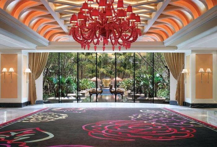 Wynn Macau is the first Las Vegas-style resort in Asia to make the list, alongside other notable online casinos such as M88. Right in front of the building, there's a stunning display fountain. Even more fascinating is the entrance, which is adorned with plants symbolizing prosperity and a dragon statue representing good fortune. Additionally, Wynn Macau features both Western and Chinese astrological symbols, with a chandelier made of crystal and a golden tree, all meant to embody hope and wealth.
