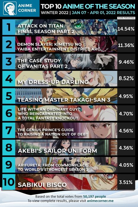What are your thoughts on the results of the top 10 successful anime of winter 2022, with victory going to 'Attack on Titan Final Season Part 2'? Does this convince you? Feel free to share your opinions!