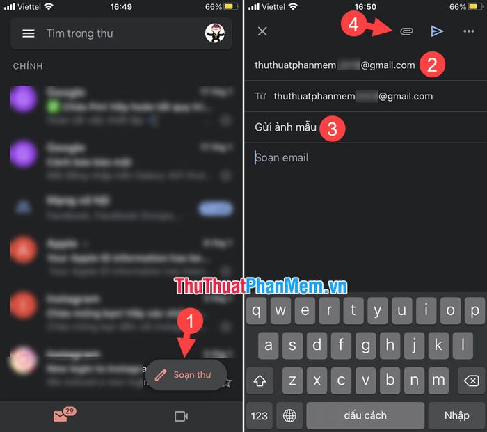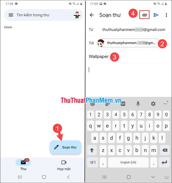 Step 1: Open Gmail app and tap on Compose (1) => enter recipient's name (2) and email subject (3) => tap on the attachment icon Attach (4).