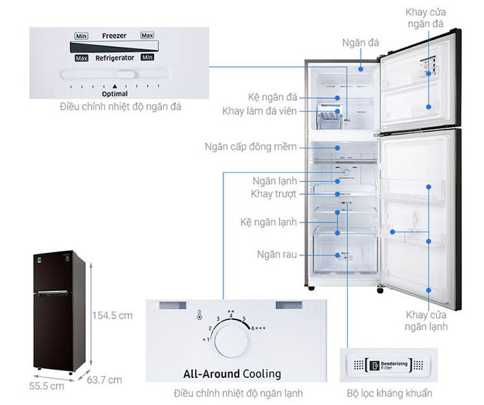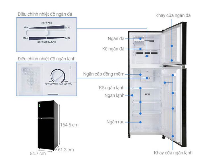 Furthermore, this two-door refrigerator model is equipped with separate cooling systems providing even cold air distribution for the compartments, preserving up to 70% moisture for food, retaining original freshness, and importantly, preventing food odors from mixing. Additionally, the refrigerator is integrated with an activated carbon filter that effectively reduces odors from mold, dust, and the pungent smell of food, ensuring the best freshness and quality for the food.