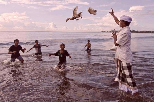 Days before the main festival, Balinese people gather on the beach for the Melasti rituals, throwing a duck into the sea and using a knife to cleanse their bodies and souls.