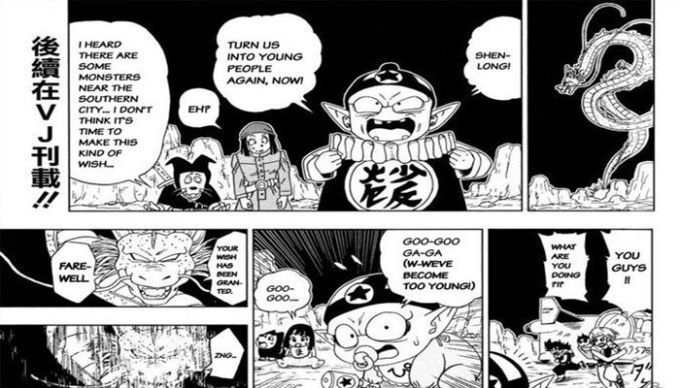 The story of what transpired in Future Trunks' timeline is disclosed at the end of chapter 2 of the manga Dragon Ball Super. Pilaf, along with his henchmen Mai and Shu, collected all the Dragon Balls to summon the dragon god Shenron. However, Pilaf ignored Shu's warning and wished to become young again. Unfortunately, Shenron misinterpreted their wish and turned them all into infants.