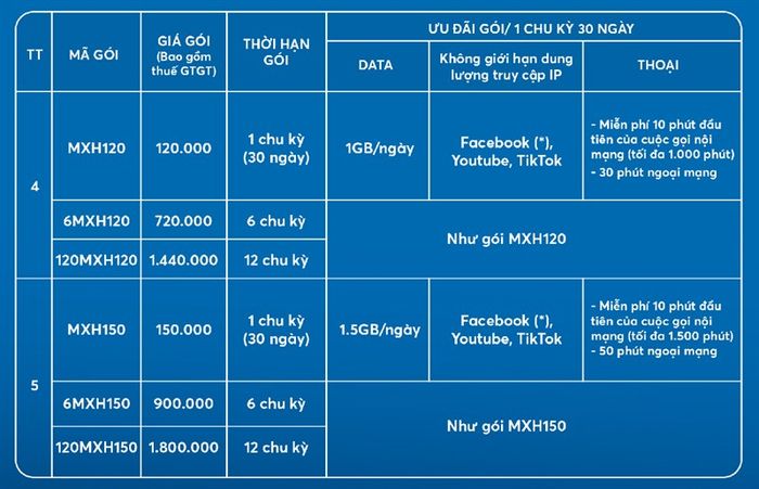 This time, MobiFone brings you the Social Network package - MXH80, MXH90, MXH100, MXH120, and MXH150. With this package, you will get: