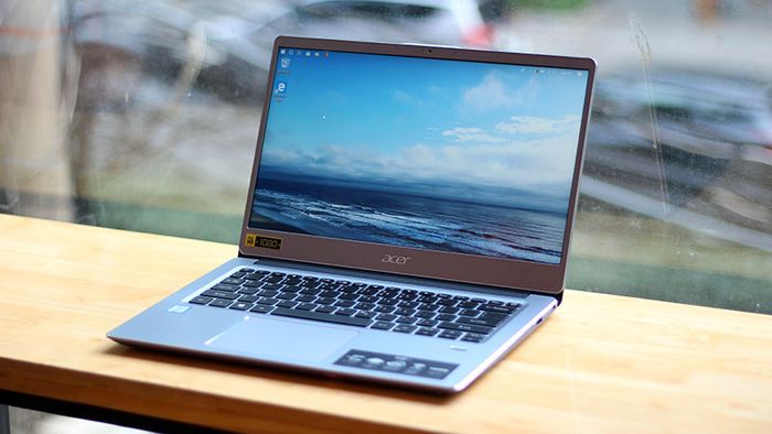 The laptop's size is very compact, just slightly larger than an A4 sheet, making it easy to carry in a bag. Additionally, the brand name 'Acer' in rose gold stands out on the laptop lid, providing a luxurious feel—a perfect design to win over business-oriented individuals at first glance.