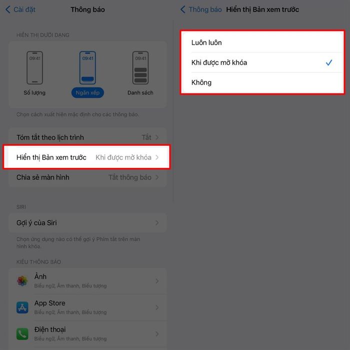 Additionally, you can choose to display notification content by tapping on Show previews > selecting content display style. You can choose Always, When unlocked, Never. For added security, it's advisable to select either When unlocked or Never only.