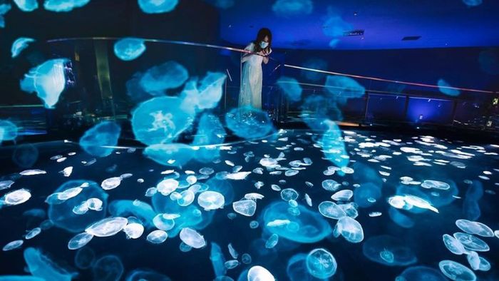 Upon entering the aquarium, visitors will see a large screen and staircase that give a sense of vastness like the open sea. As you venture deeper, you'll perceive more about the journey into the depths of the ocean with countless floating and glowing sea creatures.