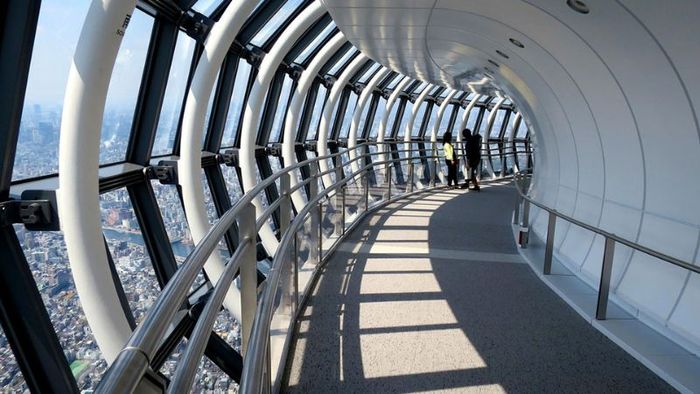 For many, riding an elevator is quite ordinary, but experiencing the elevator at Tokyo Sky Tree is different. The tower's elevators can accommodate up to 40 people and move at a speed of nearly 600 meters per minute. From here, you can admire the Tokyo cityscape from above right beneath your feet.