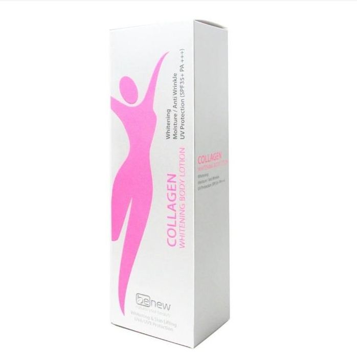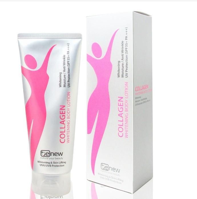 - Benew Collagen Whitening Body Lotion instantly brightens the skin tone upon application. Long-lasting gentle fragrance. SPF 35+ PA+++ protects the skin from UVA/UVB rays