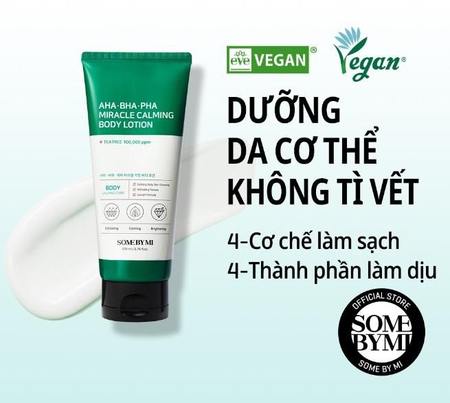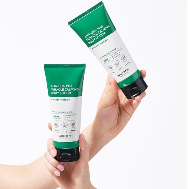 Some By Mi AHA-BHA-PHA Miracle Calming Body Lotion contains an optimal AHA-BHA-PHA compound to remove impurities, dead skin cells, cleanse pores, and control oil along with tea tree and centella extracts to soothe the body's skin, giving you healthy skin every day.