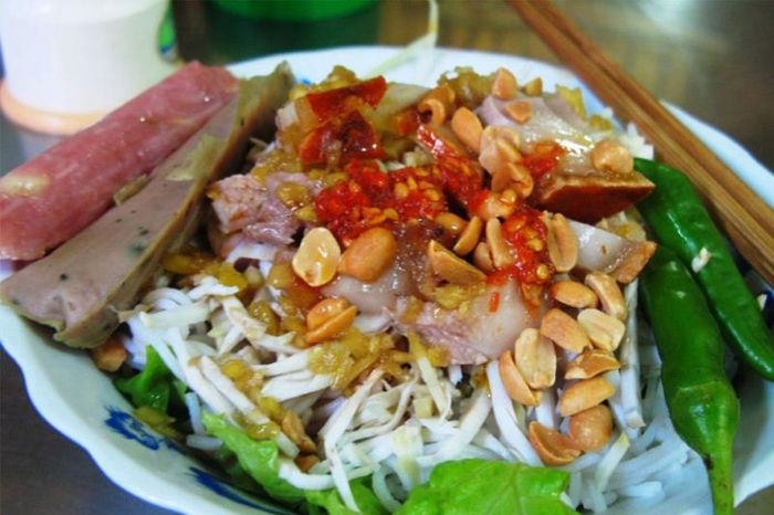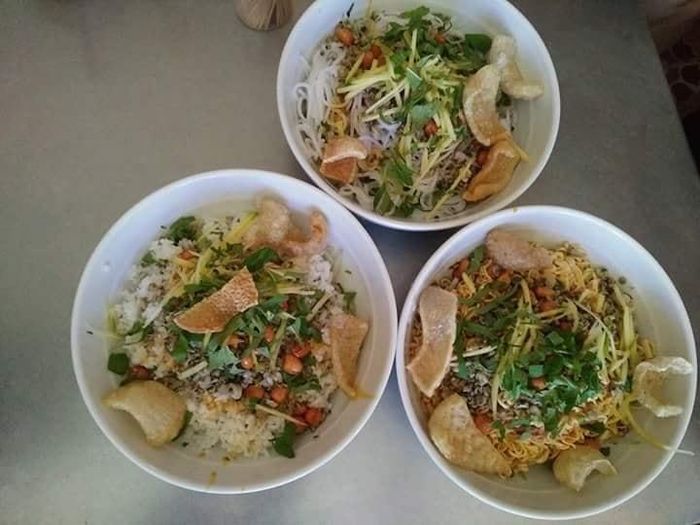- The food here tastes authentic Hue, as the owner is originally from Hue. The rice and vermicelli are filled with characteristic fresh vegetables, especially mint (or in many places also called spearmint). The clams are sweet and fragrant, stir-fried to absorb the spices, with a touch of shredded mango, roasted peanuts, satay, and crispy fried pig skin. The pig skin here is self-purchased, then fried until crispy and directly seasoned, so it is delicious and of high quality.