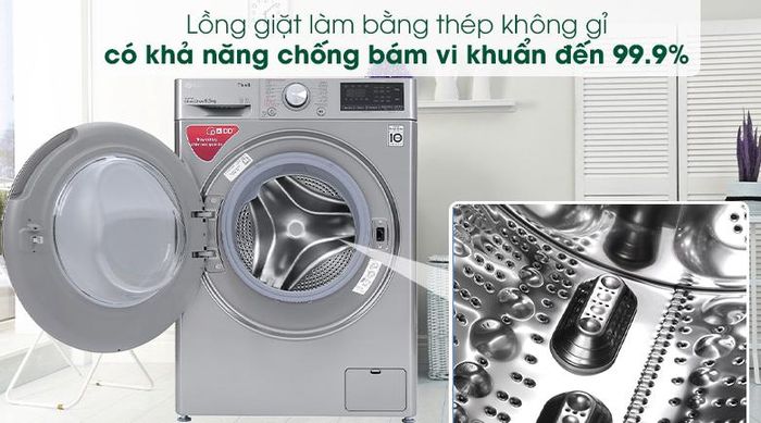 LG AI DD Inverter 8.5kg Washer FV1408S4V is designed to wash more clothes while maintaining a compact size. Its sleek gray exterior adds a modern touch to your home, and the tempered glass door along with the stainless steel drum ensures durability and 99.9% antibacterial protection for your clothes.