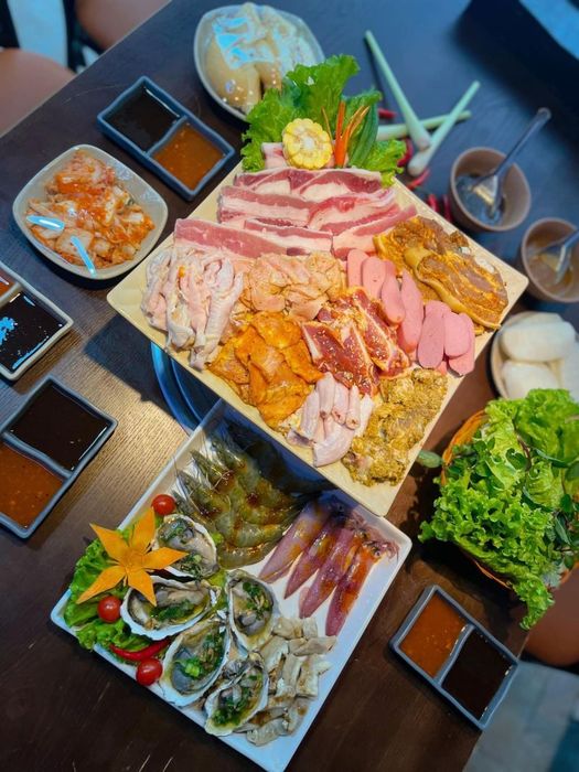 Lẩu Nướng ByLeng is known for its exclusive hotpot broth recipe, perfectly balancing sweet and sour flavors that leave a lasting impression. The dipping sauces are equally remarkable. Each set comes with a variety of fresh ingredients like shrimp, green shrimp, fish balls, crab sticks, sausages, American beef belly, American beef, and wontons. The best part? The affordable prices allow you to order extra plates of ingredients after finishing your set.