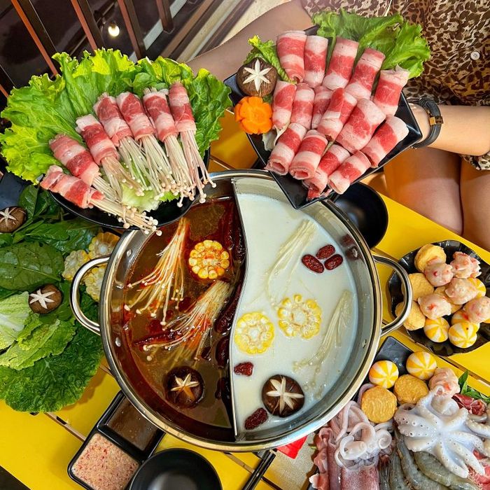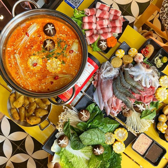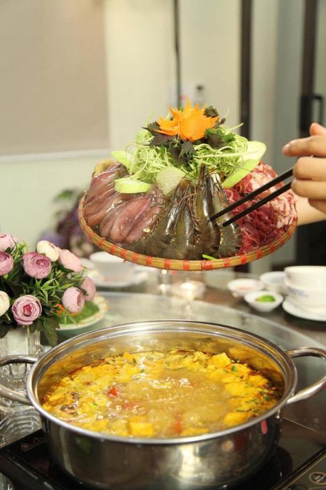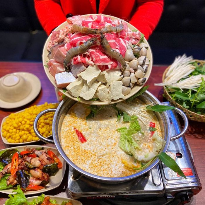 The hotpot sets at Phuong Anh Hotpot & Grill are absolutely addictive. The restaurant offers four hotpot broths: Sichuan, kimchi, chicken soup, and sour-spicy. Along with various meats, fish, vegetables, mushrooms, and hotpot balls, the restaurant uses a two-compartment hotpot pot, allowing customers to enjoy multiple flavors. The rich, fatty American beef belly and the tender, sweet salmon fillet dipped in the bubbling broth are guaranteed to satisfy. In addition to the hotpot, Phuong Anh Hotpot & Grill also offers a variety of impressive side dishes, such as: fruit spring rolls, fried tofu with pork floss, potato-wrapped shrimp, pineapple rice, and butter-fried squid rings...