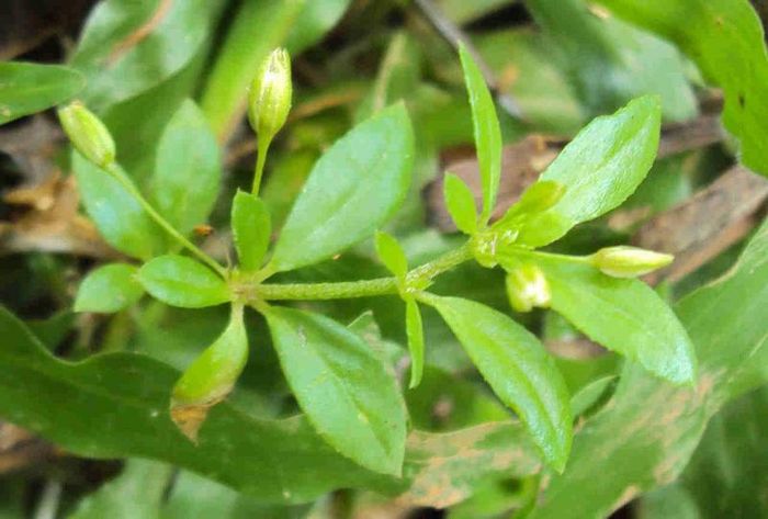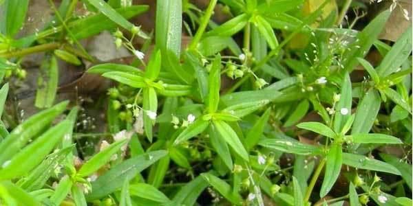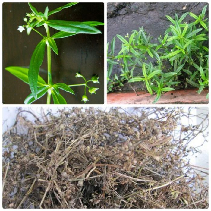 Oldenlandia diffusa is a small grass species, creeping and can live up to several years. The stem of the plant is light brown, round at the base, young stems are four-angled, bearing many branches. The leaves are lanceolate, about 1.5 - 3.5 cm long, and 1 - 2 mm wide, pointed at the apex, gray in color, leathery, almost without petioles, with toothed margins. The flowers of snake tongue grass grow singly or in pairs in the leaf axils. The flowers of this plant species are small, with spherical calyx tubes and 4 pointed sepals. The corolla consists of 4 petal lobes, and the stamens are attached to the throat of the corolla tube. The fruit is spherical and slightly flattened at the apex, containing many small angular seeds.