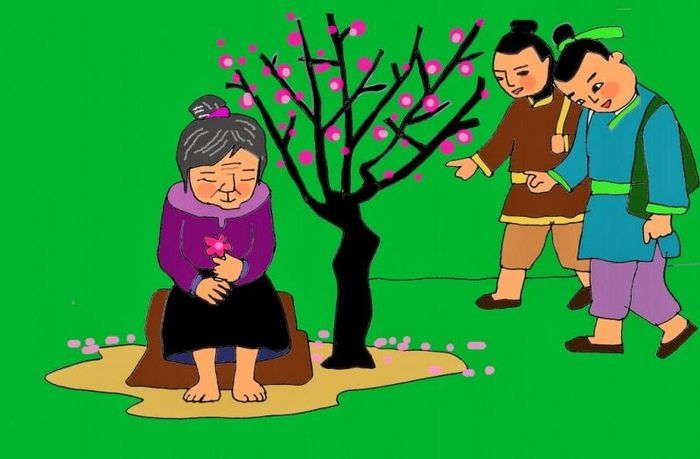 The messengers, unable to reach the Sun God, returned in despair. As they passed through a forest, they encountered an elderly woman sitting quietly, gazing at a blossoming peach tree. The messengers approached her and asked: