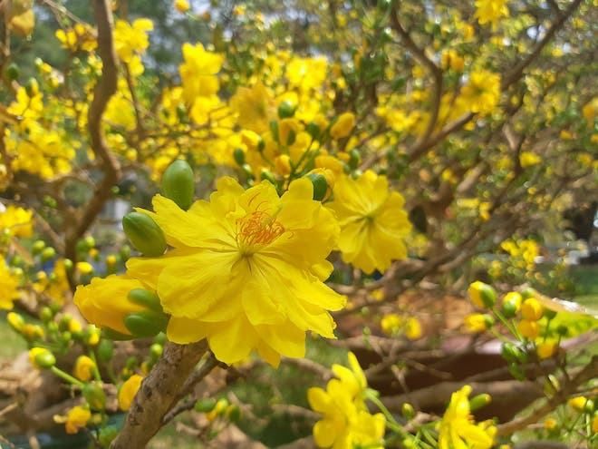 And so, every year on the eve of the Lunar New Year, the girl in yellow would return to visit her family. But once her parents and sister passed away, she no longer returned. She transformed into a golden apricot tree, blooming with flowers in the color of her robe. The flowers bloomed for nine or ten days around the Tet holiday before falling off, only to return the next year. People now call this tree the Mai Vàng, or Golden Apricot Tree. Every Tet, families in Central and Southern Vietnam buy a branch of Mai Vàng to decorate their altars, believing it brings beauty, joy, and wards off evil spirits for the whole year.