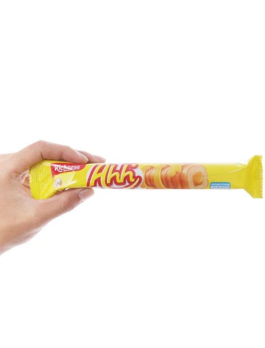 The waffle has a compact shape and an appealing golden color, with a thin, crispy outer layer that provides a delightful crunch when bitten into. Inside, the waffle has a soft, smooth texture that adds to the overall taste experience. The highlight of the Richeese Ahh waffle is its rich, creamy cheese flavor. With a savory, creamy, and delicious taste, this waffle is sure to captivate anyone who loves cheese. The balanced sweetness and distinctive cheese flavor create a perfect and irresistible combination.