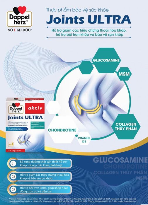 Joint Function Improvement and Osteoarthritis Progression Prevention Supplement: Doppelherz Aktiv Joints Ultra supports the treatment of bone and joint diseases. With an optimal formula combining Glucosamine Sulfate and Chondroitin Sulfate, it helps improve joint function and prevent joint degeneration, restoring cartilage structure and lubricating joints.
