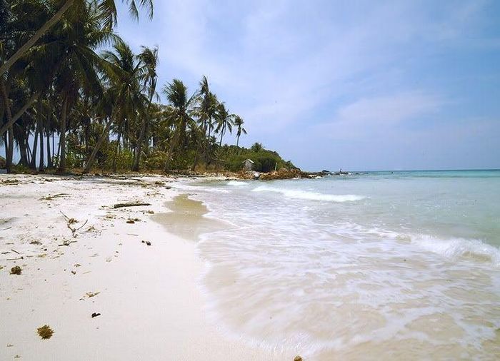 Upon arriving at Mấu Island, visitors are often struck by its natural beauty. The island features several pristine beaches named after the winds, such as Chướng Beach, Bấc Beach, and Nồm Beach. Chướng Beach, the most beautiful, boasts a mile-long stretch of fine white sand, palm trees swaying in the breeze, and crystal-clear turquoise waters, so clear that the sea floor is visible even several meters out, offering a perfect spot for a refreshing swim.