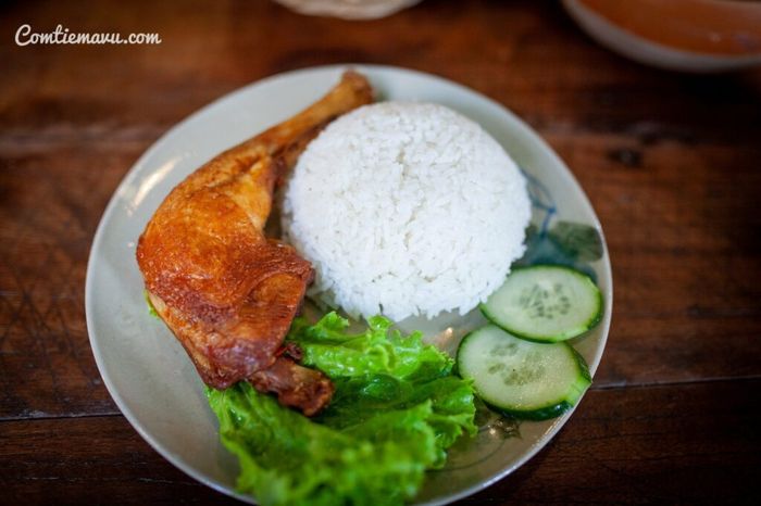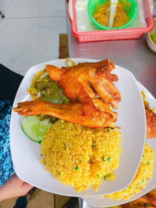 A serving of chicken rice ranges from 55,000 – 65,000Đ and is of high quality. The chicken options are quite diverse: buttered chicken, boiled with five flavors, fried with fish sauce. The chicken thighs are fried with fish sauce and coated with a spicy garlic chili sauce that sticks to the crispy chicken skin, while the meat inside is tender and hot. One secret to making the chicken meat even tastier is that it's lightly steamed before frying to retain moisture. The rice is perfectly fried, not too hard, and served with pickled mustard greens to balance the flavors. Just thinking about it makes you hungry.
