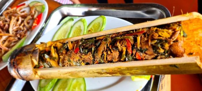 The preparation of Wild Bamboo Shoot Soup involves placing all the ingredients inside a fresh bamboo tube, which is sealed at the ends. The tube is then placed at an angle over a fire and rotated to cook the soup evenly. Once it is perfectly cooked, a thorny vine is inserted into the tube to mash and mix all the ingredients together, resulting in the flavorful “thut” (smashed) soup. When served, diners are greeted with the fragrant aroma of wild herbs, the spicy kick of the chili, and the rich, savory taste of bamboo shoots. The first bite may be slightly bitter due to the bamboo shoots, but the sweetness quickly follows, making it incredibly addictive.