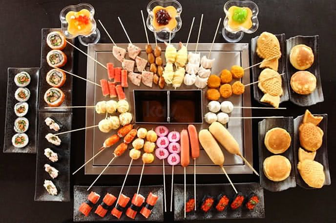 Prepare to be amazed by the diverse menu options available at our restaurant, featuring a wide array of sushi and skewers such as: green rice egg rolls, squid balls, shrimp balls, tempura, salmon spring rolls, sausage-stuffed cheese, seaweed-wrapped fish rolls, rice ball basa, salted egg seafood balls, and more.