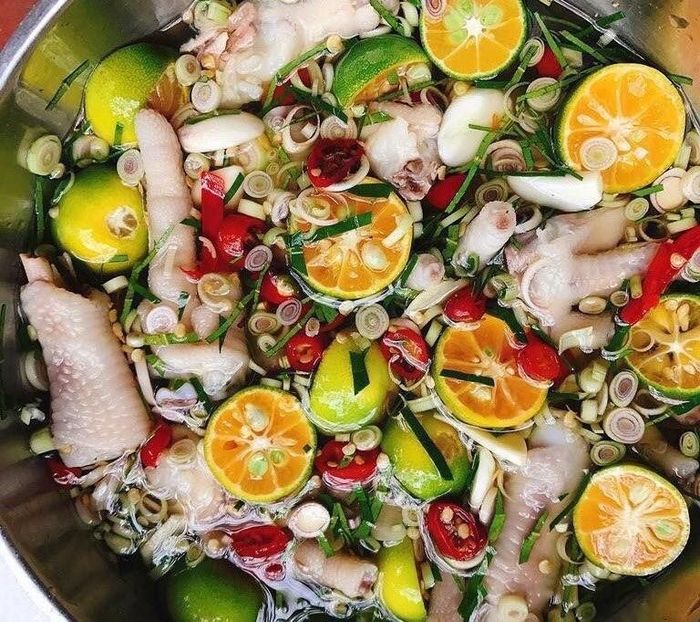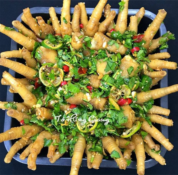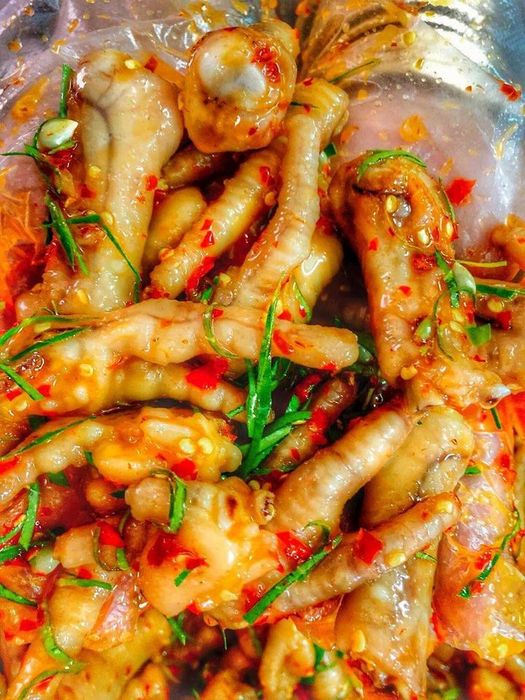 The familiar dish of marinated chicken feet in lemongrass and tamarind has become quite popular with its sour taste of tamarind, the fragrant aroma of lemongrass, and the chewy texture of the marinated chicken skin, making it irresistible. This dish is perfect for picnics, leisurely meals, or snacks.