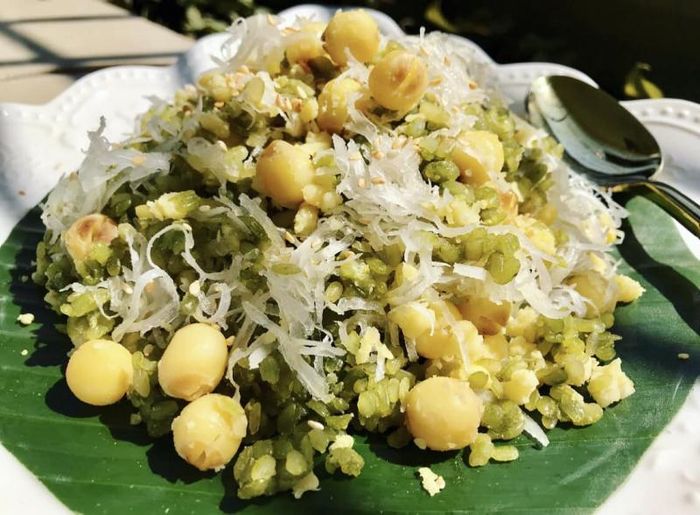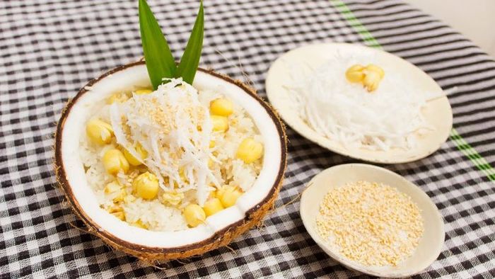 - Step 2: Make the Sticky Rice with Lotus Seed and Mung Bean: Put the glutinous rice, mung beans, and lotus seeds in a large bowl. Add 1 teaspoon of salt and mix well to make the rice more flavorful. Place the mixture into a steamer and steam over high heat for about 20 - 25 minutes. While steaming, add 1 teaspoon of sugar to the coconut milk and stir gently until the sugar dissolves. Then, put the shredded coconut in another bowl and mix well with 1 teaspoon of sugar. After steaming the rice for about 20 - 25 minutes, open the lid to check if the lotus seeds are soft. Then, mix in the shredded coconut. Next, pour the coconut milk mixture over the rice, mix well. Finally, steam for another 15 minutes to allow the rice to absorb the coconut milk and become soft and chewy.