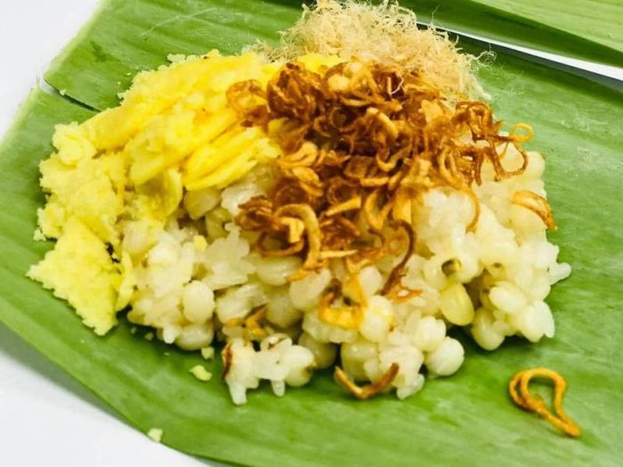 - Mix the glutinous rice with the lotus seeds and steam in a steaming pot for about 20 minutes. Once the sticky rice is cooked, add the mung beans and continue steaming for another 20 minutes. Transfer the sticky rice to a wide plate, place banana leaves on top, drizzle with some cooking oil, and 1 tablespoon of condensed milk while the rice is still hot to make each grain glossy.