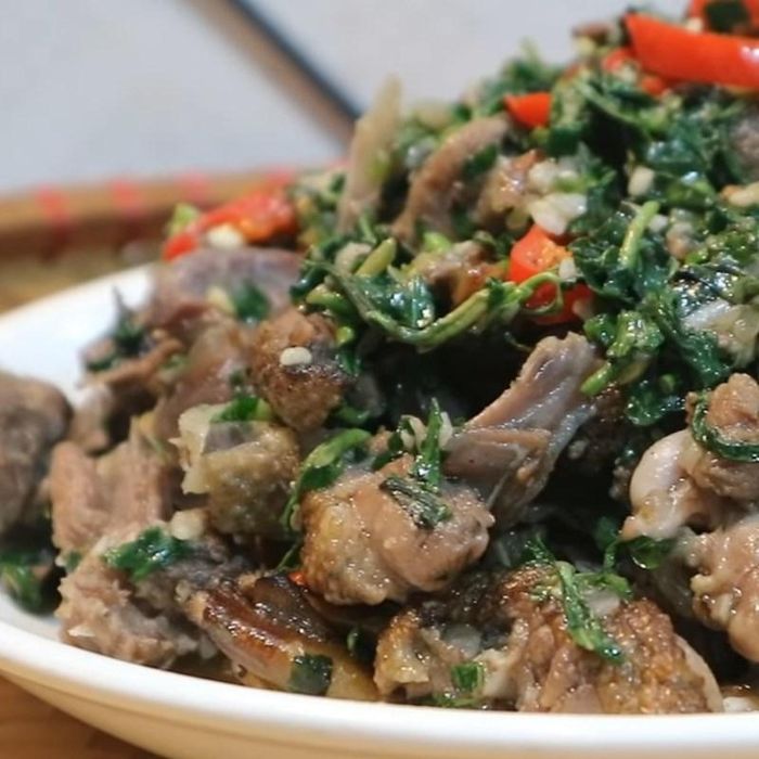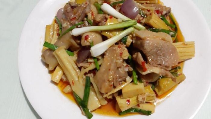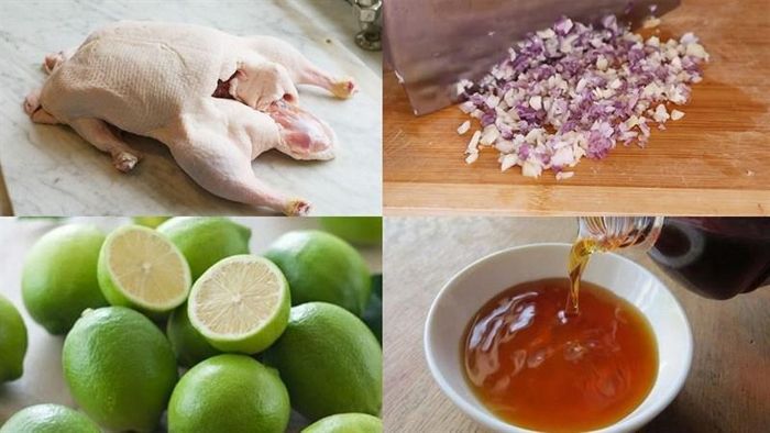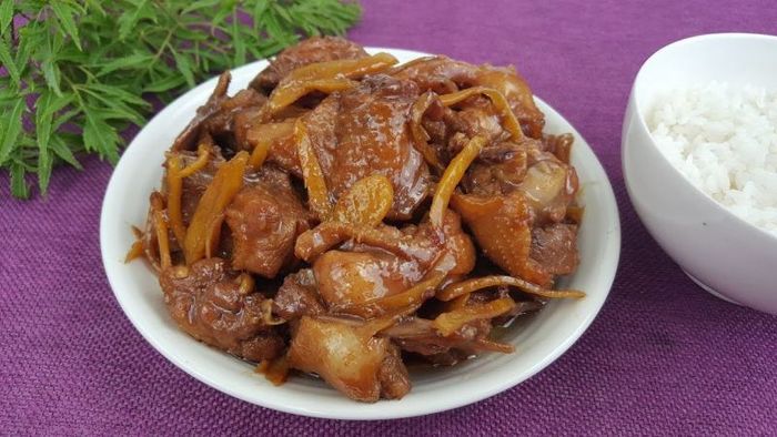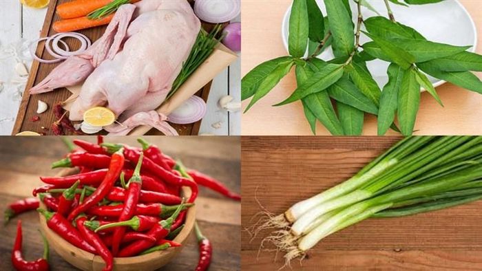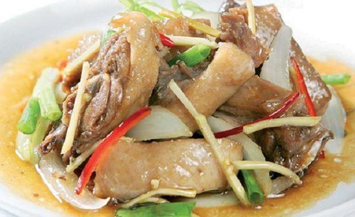 Ingredients: 1 duck, 2 pieces of ginger, 4 - 5 cloves of garlic, 5 dried shallots, 3 - 4 dried chilies, some scallions, fish sauce, sugar, ground pepper, bouillon, white wine. Method: Step 1: Mix wine with finely chopped ginger and rub it all over the duck to remove the odor, then chop it into small pieces. Step 2: Chop garlic, ginger, scallions, and dried chilies finely, then marinate the duck with 1/2 of the garlic, 1/2 of the ginger, 1/2 of the scallions, sugar, bouillon, fish sauce, ground pepper, and mix well, marinate for about 20 minutes. Step 3: Saute the rest of the shallots, garlic, and ginger until fragrant, then add the duck to stir-fry until the meat firms up, add a little water and continue stir-frying until nearly dry, then add scallions seasoning.