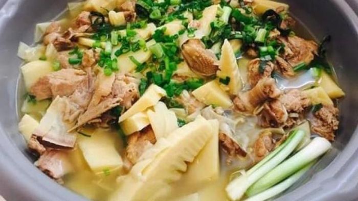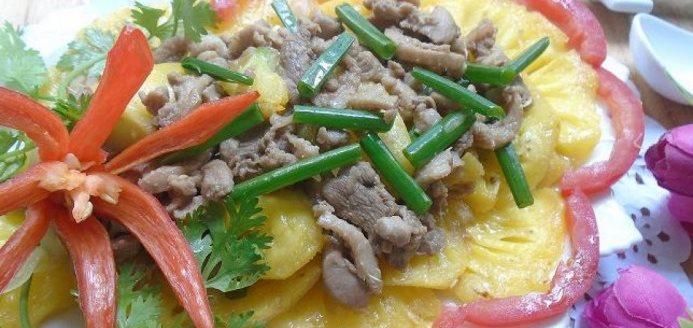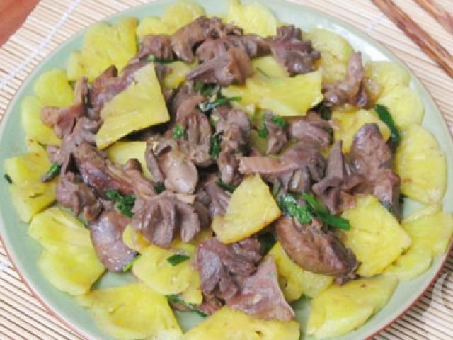 Ingredients: 700g duck meat or 1 small duck, 1 pineapple, shallots, garlic, scallions, white wine, cornstarch, ginger, cooking oil, bouillon, sugar, MSG, pepper. Method: Step 1: Prepare ingredients: Clean the duck meat, wash with white wine and finely chopped ginger to remove the odor. Then, cut the duck into bite-sized pieces and marinate with chopped shallots, garlic, bouillon, MSG, sugar, and pepper. Marinate for 30 minutes for the duck to absorb the flavors. Peel and cut the pineapple into thick slices. Peel and finely chop the dried shallots and garlic. Dissolve cornstarch in water. Cut the scallions into sections. Step 2: Stir-fry the duck: Heat cooking oil in a pan, add chopped shallots and garlic, sauté until fragrant, then add the marinated duck and stir-fry evenly. When the duck starts to soften, transfer it to a separate plate. Step 3: Stir-fry the duck with pineapple: Heat the pan, add oil and chopped shallots and garlic, sauté until fragrant, then add pineapple and stir-fry until the pineapple releases juice. Then add the duck and season with MSG, bouillon, sugar, fish sauce to taste. Stir-fry until the duck absorbs the seasoning, then add dissolved cornstarch and water to the pan, stir-fry for about 2 minutes until the dish thickens, then turn off the heat. Finally, sprinkle chopped scallions on top and serve the dish.