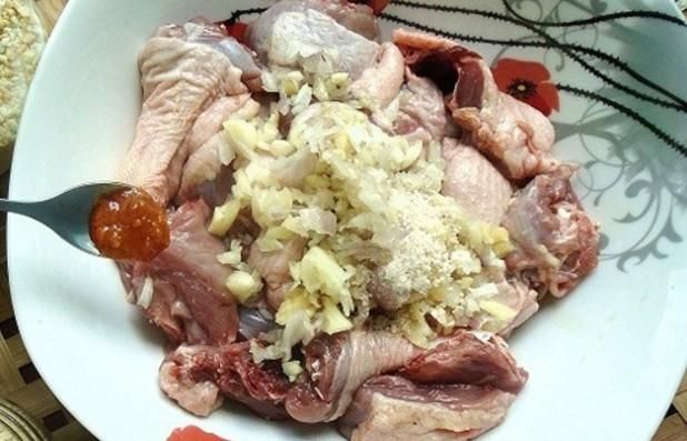 Marinate the meat with the following mixture: 1 tablespoon chili paste, 2 teaspoons seasoning powder, 1/2 teaspoon salt, 1/2 tablespoon sugar, 1 teaspoon five-spice powder, 1/2 teaspoon curry powder, 1 tablespoon vegetable oil, 1/2 tablespoon turmeric powder, 1/2 tablespoon oyster sauce, 1 tablespoon fish sauce. Mix all the ingredients well and marinate for about 30 - 45 minutes to let the meat absorb the flavors.