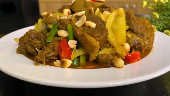 This aromatic stir-fried duck dish with curry and turmeric aroma features tender duck meat seasoned just right, boasting a beautiful golden color. The broth is sweet and savory with a hint of richness from the coconut cream. Especially delightful when served with hot rice.